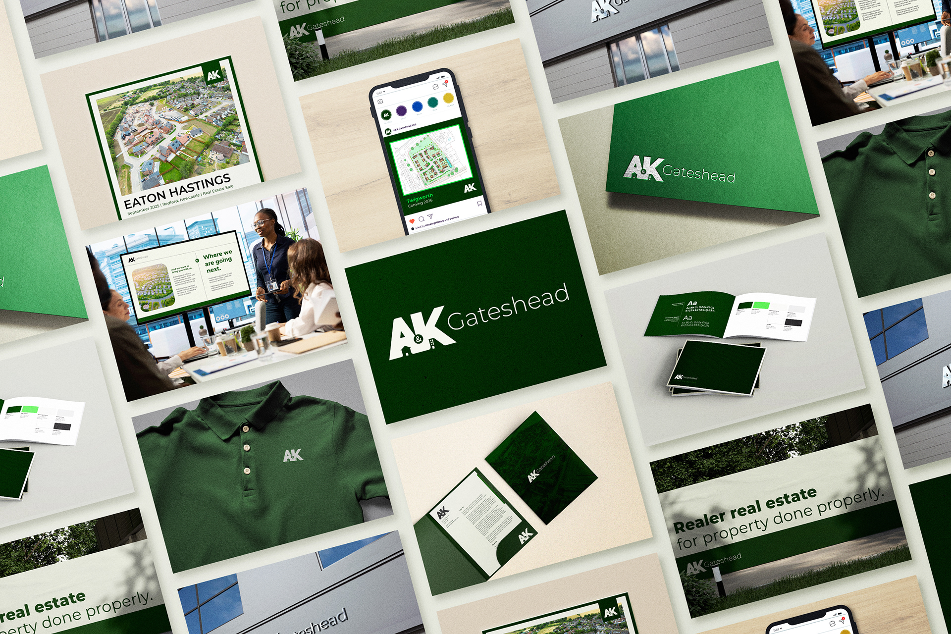 Brand identity, guidelines and assets for A&K Gateshead, a real estate company from the UK. Developed from concept to execution in under 3 weeks.